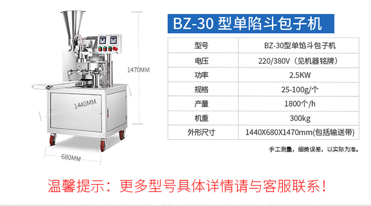 名稱XZ-86型全自動包子機 電源220/380V(見機器名牌) 功率2.4kw 產(chǎn)量0-3600個/小時 尺寸1600*720*1600mm(包括輸送帶) 重量350kg 規(guī)格20-150克/個 其他