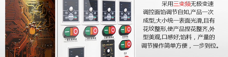 ?三變頻無極變速調(diào)控,生產(chǎn)速度、制品大小、內(nèi)餡含量及生產(chǎn)產(chǎn)量皆可隨意調(diào)控;