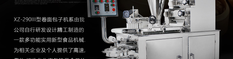 旭眾牌XZ-290III型卷面式包子機是由本公司自主設(shè)計研發(fā),精工打造的一款專業(yè)仿手工生產(chǎn)制作各種包餡類食品的高效實用型機械設(shè)備,是一款生產(chǎn)肉包、菜包、小籠包、豆沙包、奶黃包等多種包餡類產(chǎn)品的多功能實用新型食品機。