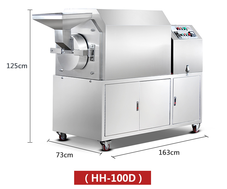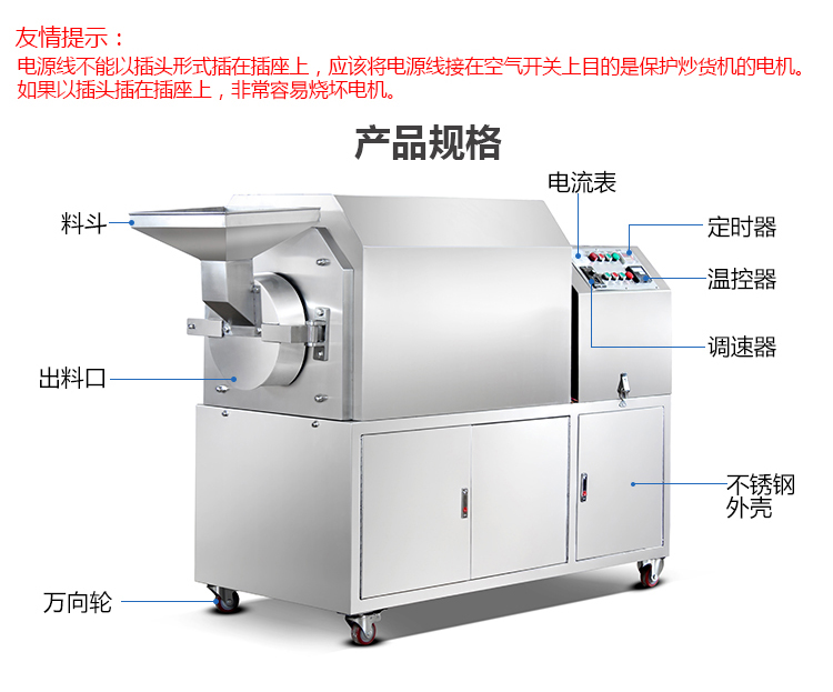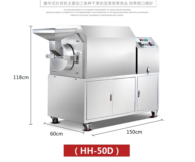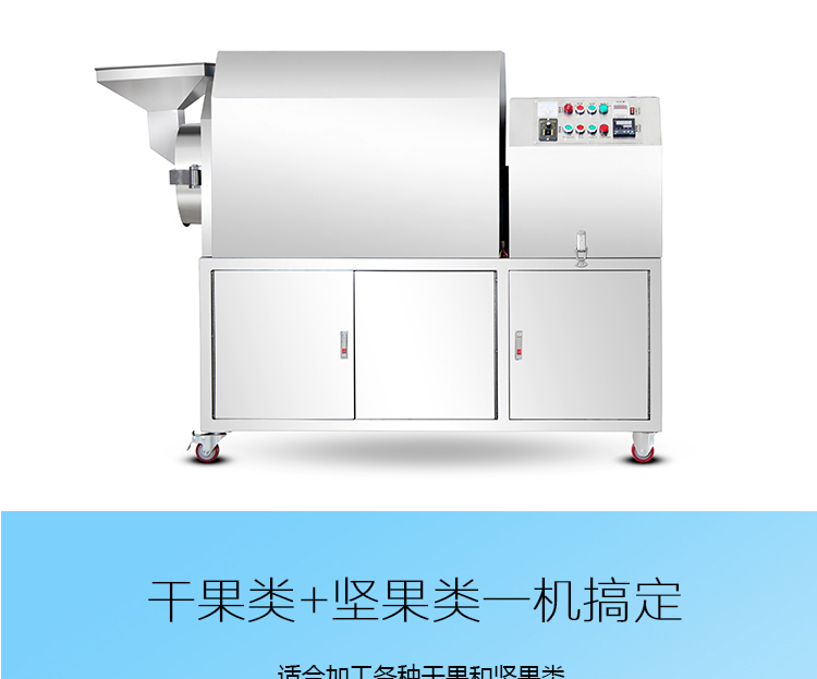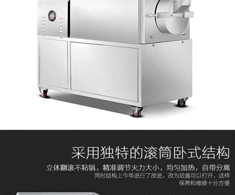 1.豪華炒貨機采用不銹鋼材質(zhì),獨特的滾筒臥式結(jié)構(gòu),加熱均勻,密封性好,燜炒效果好。同時結(jié)構(gòu)上今年進行了改進,改為后蓋可以打開,這樣保養(yǎng)和維修十分方便,下料的地方增加漏斗,操作更方便!