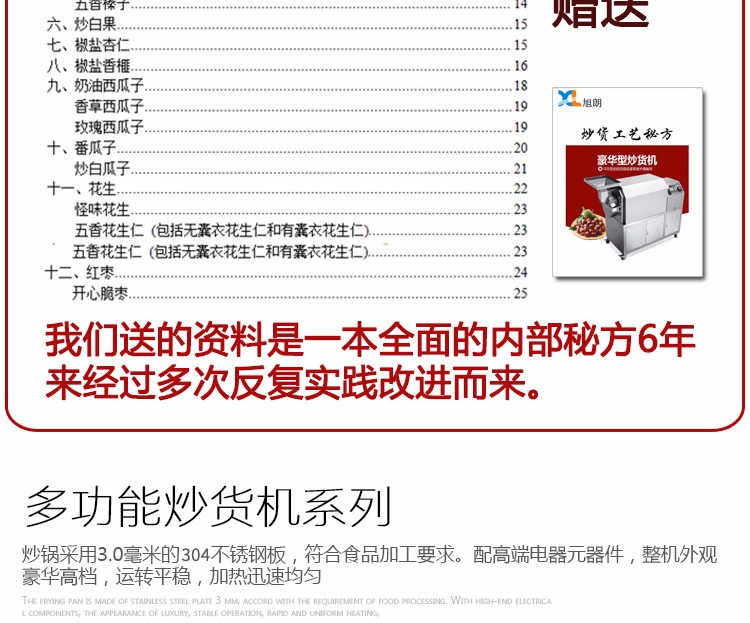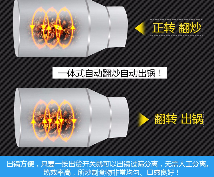 9.豪華炒貨機結(jié)構(gòu)合理,操作簡單,熱效率高,所炒制食物非常均勻、口感良好!