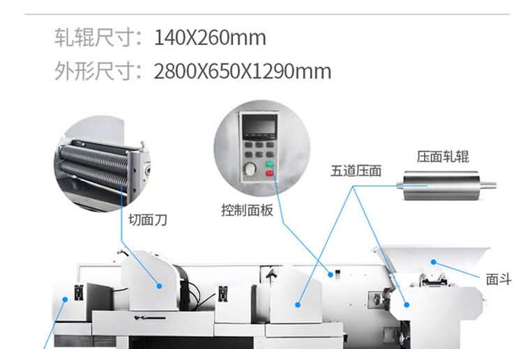 MT5-280面條機(jī) (掛面機(jī)或濕面機(jī)) | 外形尺寸:2300×620×1400mm 產(chǎn)量:230kg/h 軋輥:98×300mm 功率:3kw 軋輥組數(shù):5組 機(jī)重:500kg | 鐵外殼 |