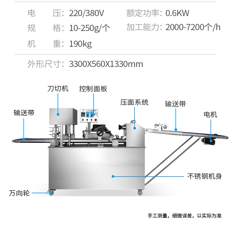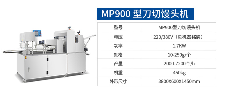 名稱MP800A型刀切饅頭機(jī) 電源220/380V(見機(jī)器銘牌) 功率0.6kw 產(chǎn)量2000-7200個/h 尺寸3300×560×1330mm 重量190kg 規(guī)格10-250g/個 其他