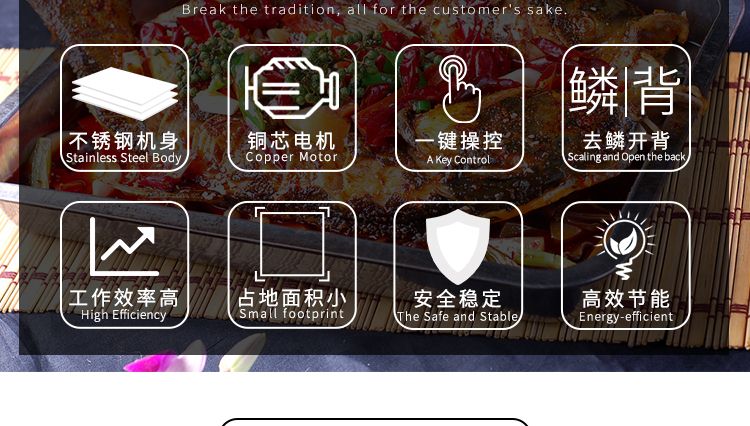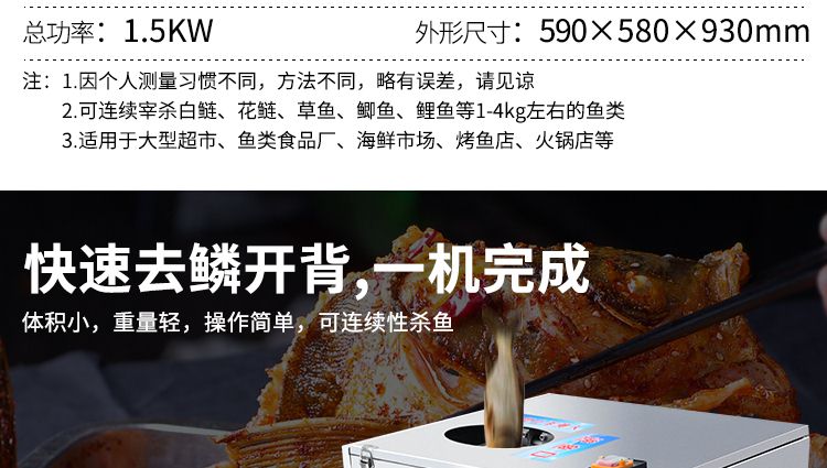 本設(shè)備為魚(yú)類(lèi)食品加工廠,大型超市,機(jī)關(guān)食堂,海鮮市場(chǎng),農(nóng)貿(mào)市場(chǎng),烤魚(yú)店,酸菜魚(yú)店,火鍋店等餐飲酒店帶來(lái)高工作效率。