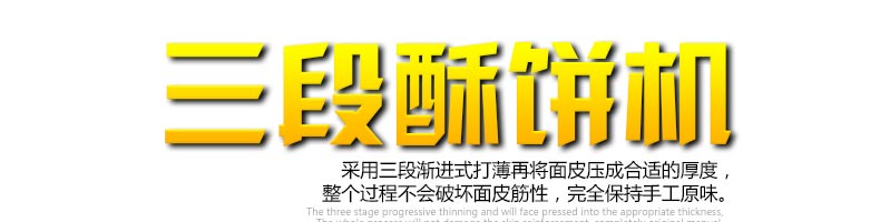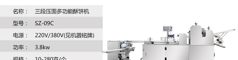 名稱SZ-09C三段壓面酥餅機(jī) 電源220/380V(見機(jī)器名牌) 功率3.8kw 產(chǎn)量0-3600個/小時 尺寸3200×840×1630mm 重量700kg 規(guī)格10-100克/個 其他
