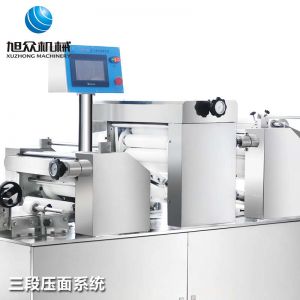 旭眾牌XZ-15C三道搟面酥餅機是我公司仿手工制作面食產(chǎn)品的機型,占地面積小,重量輕,它吸收國內(nèi)傳統(tǒng)手工制作技術(shù),即運用搟面杖壓面和打擊面團(tuán),以保證高面筋性和面帶的密度,并綜合考慮面食的口感而研發(fā)。