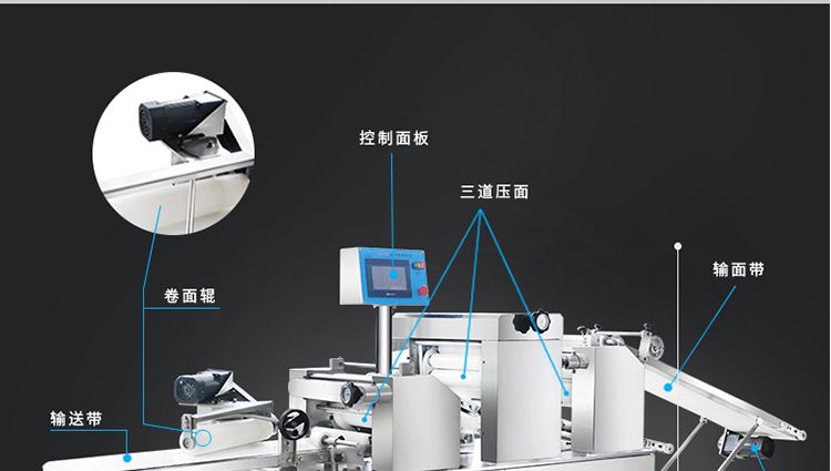 ?生產(chǎn)速度快,效率高,生產(chǎn)流程流暢,各環(huán)節(jié)都輔以電控設(shè)備控制,不會出現(xiàn)堵面,破酥等現(xiàn)象;