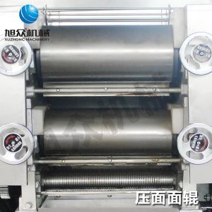 將攪拌好的面粉均勻的放進去,面對輥將松散的面粉初壓成面皮,合皮部分有一對軋輥,它將兩層復合面皮合成一層,延軋部分由兩對軋輥組成,將面皮軋成所需的厚度,切條部分是將一定厚度的面皮切成所需寬度的面條,上門架部分把切斷后的面條自動挑起。