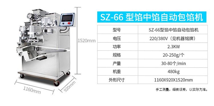 名稱SZ-65型多功能包餡機(jī) 電源220/380V 功率1.9kw 產(chǎn)量20-80個(gè)/分鐘 尺寸1130×920×1650mm 重量400kg 規(guī)格20-250克/個(gè) 其他皮餡比例2:8 5:5